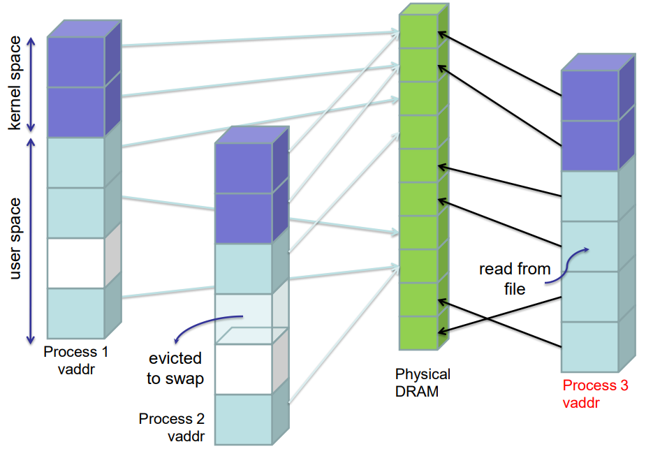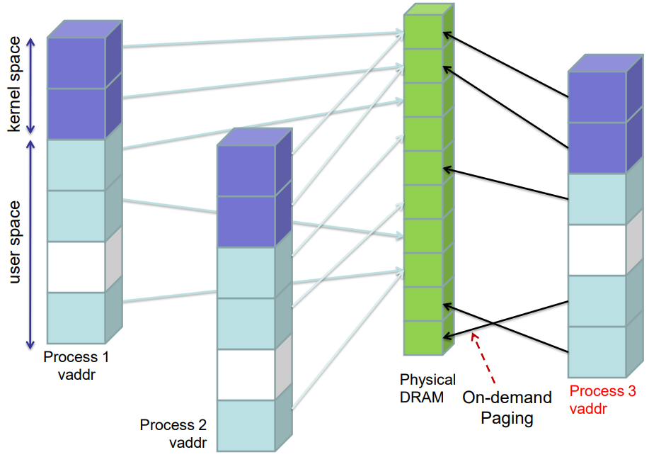 - 프로세스가 실제 시스템에 있는 것보다 더 많은 메모리에 액세스할 수 있도록 허용(또는 모든 프로세스가 사용하는 모든 메모리의 합 > 물리적 메모리)