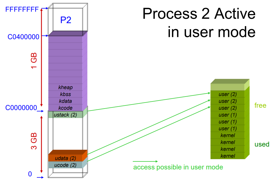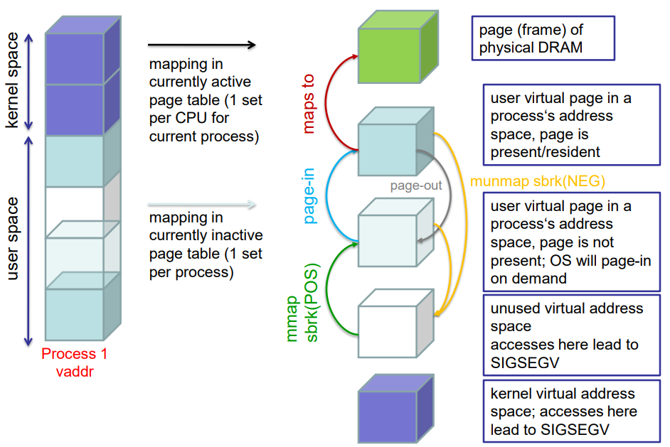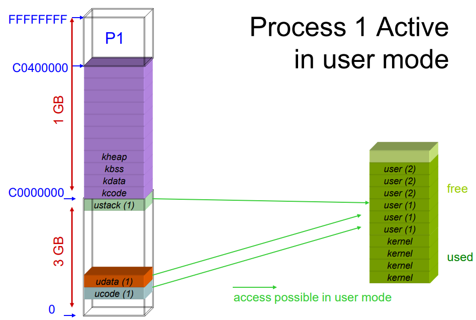 - 다음 사진들은 모드 switch/context switch/mode 스위치 시퀀스에서 virtual-to-physical 매핑이 어떻게 변경되는지 보여준다 (커널 수준 구현 세부 정보도 조금 보여준다)