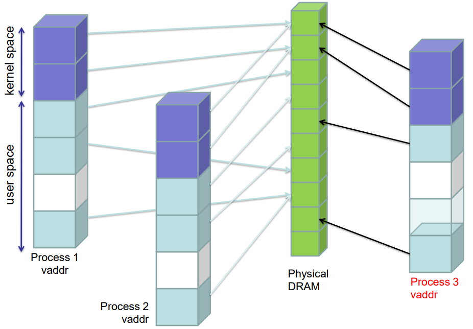 - OS가 각 프로세스에 대해 프로세스별 페이지 테이블에 {가상 주소} → {물리적 주소} 매핑을 유지 관리함