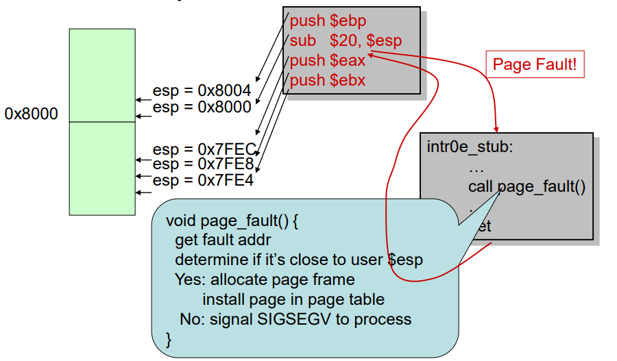 - 프로세스가 현재 매핑되지 않은 주소에 액세스하면 하드웨어가 고장 신호를 보낸다