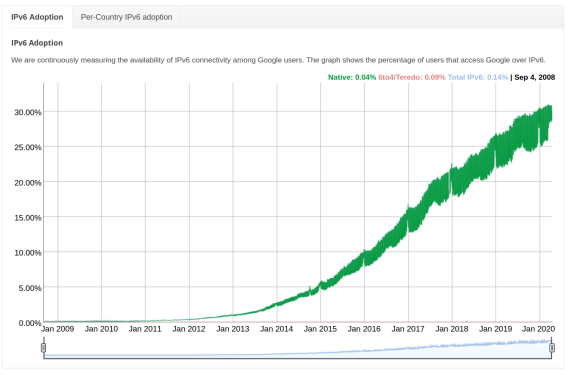 구글 서비스에 접속하는 사용자들 사이에서 IPv6 채택률