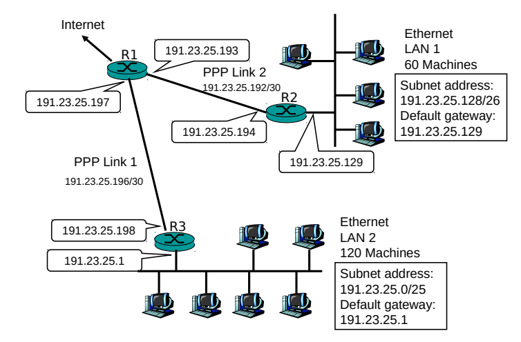 당신이 작은 회사에 의해 네트워크 관리자로 고용되었다고 가정해보자. 191.23.25.0/24에 256개의 작은 블록 주소가 제공되고, PPP (Point-to-Point Protocol)를 통해 2개의 개별 사이트에 60/120 시스템이 있는 2개의 LAN을 ISP의 에지 라우터에 연결해야 한다. 각 서브넷에 어떤 IP 주소를 할당해야 할까?