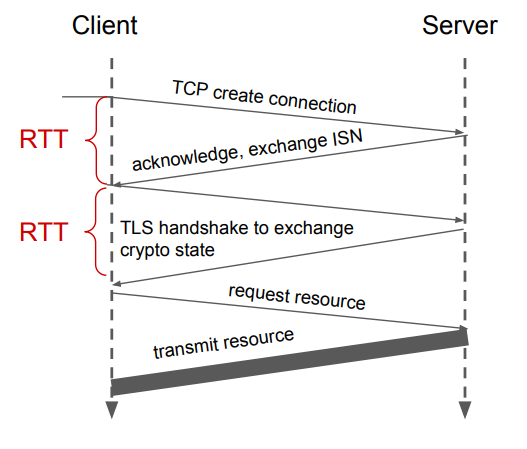 - 성능 측면에서 적절한 TLS 프로토콜이 협상되는 TCP 핸드셰이크에 이어 TLS 핸드셰이크가 추가되었다