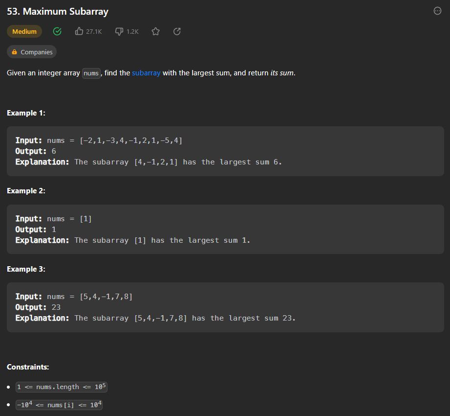 Leetcode 53번 문제는 정수형 배열이 있을 때, 그 배열의 subarray 즉, 부분 배열(주어진 배열의 연속한 일부분) 중 각 원소의 합이 가장 큰 부분 배열을 찾는 문제이다. 여기서 subarray란 주어진 배열에서 끊기지 않고 인접한 원소들의 집합이다. 예를 들어 [1,2,3,4,5]라는 배열에서 subarray는 [1,2], [2,3,4] 등등이 될 수 있다. 하지만 [1,3,5] 같이 인접하지않는 원소들로 구성된 배열은 subarray라고 할 수없다.