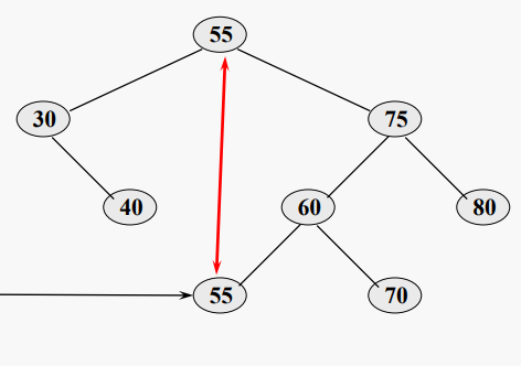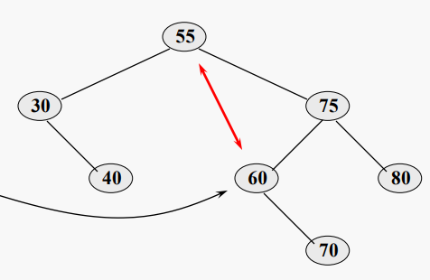 BST에서 값 55를 삭제한다고 가정하자. 55를 60으로 교체한 후, 삭제해야 한다. 또한 값 75를 삭제하는 것도 고려해 보십시오. 이 경우 오른쪽 하위 트리는 원래 삭제 대상 노드인 리프 노드일 뿐이다