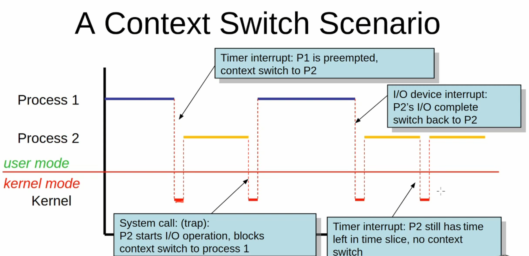 Context switching은 CPU가 현재 실행하고 있는 process를 저장하는 역할을 하고 다음 process의 register값 (context)을 읽어 다음 process의 context로 switch하는 과정이다. 여기서 context란, 프로그램 텍스트, 프로그램 텍스트의 위치(PC/IP), 그 외의 변수들(글로벌, 힙, 스택, cpu register 등등) 현재 실행되고 있는 프로그램의 상태 정보를 말한다. 보통 context swiching은 kernel이 관리기 때문에 mode-switching과도 상호작용한다.