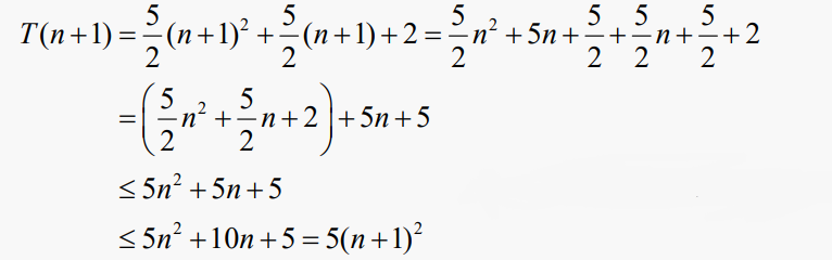 따라서, 수학적 귀납법에 의해, 모든 n ≥ 2에 대해 T(n) ≤ 5n2이다. 따라서, 정의에 따르면, T(n)는 O(n^2)이다.