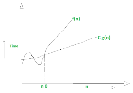 수학적으로, 만약 f(n)가 알고리즘의 실행 시간을 설명한다면, f(n)는 O(g(n)이고, 양의 상수 C가 존재하고 n이 존재한다면, 모든 n >= n0에 대해 0 <= f(n) <= Cg(n)이다.