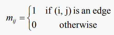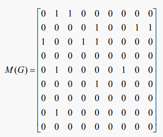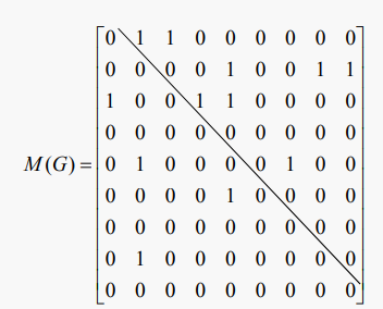그래프는 2차원 인접 행렬로 표현될 수 있다. 만약 G가 n개의 = |V| 꼭짓점을 갖는다면, M은 다음과 같이 정의되는 n개의 n개의 행렬이라고 하자