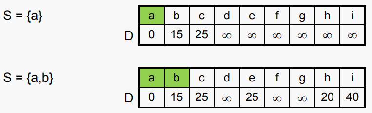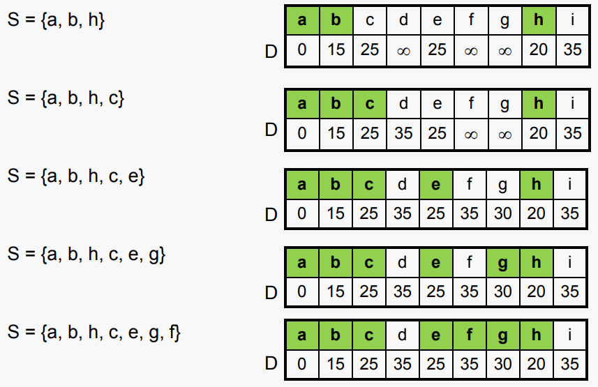 S를 우리가 s에서 v까지의 최단 경로 거리 D(v)를 결정한 G의 정점의 집합이라고 하자. 처음에, S = {s}와 D(s) = 0 이다. 그리고 다음을 만족하는 정점 v를 선택한다: