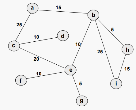 프림 알고리즘은 앞서 봤던 다익스트라 알고리즘과 굉장히 유사하다. 프림 알고리즘은 실제로 적용되는 그래프가 연결된 경우 최소 비용의 스패닝 트리를 만든다. 위의 트리에 프림 알고리즘을 적용해보자: