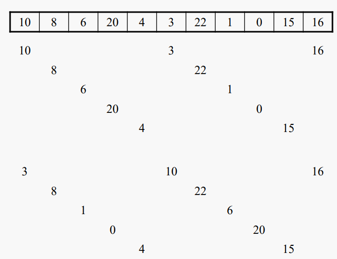 - 요소가 단계 크기, h, 간격인 불연속 하위 목록으로 목록을 분할한다.