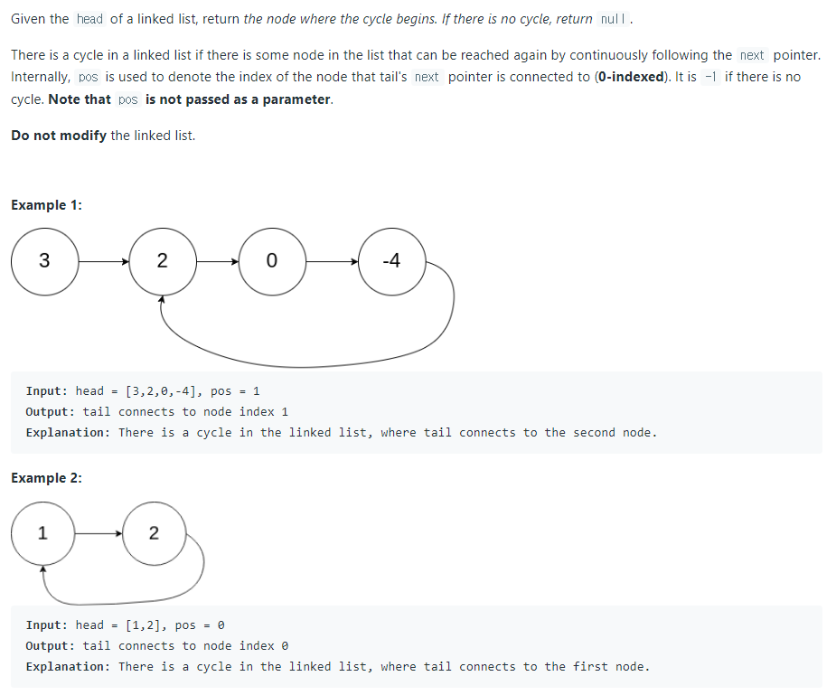 Leetcode 142번 문제에서는 Linked List가 주어지고, 주어진 Linked List에서 cycle이 발생하는지 알아내고, 발생하면 발생 지점의 노드를 반환하고, cycle이 발생 하지 않으면 null를 return해주면 된다.