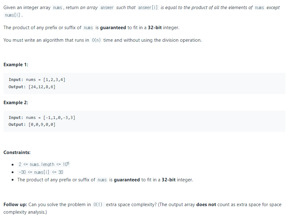 Leetcode 238번 문제는 정수로 채워진 array가 주어지고, 원래의 index에있는 값을 제외한 모든 index의 값을 곱한 값이 들어있는 array를 return하는 문제이다.