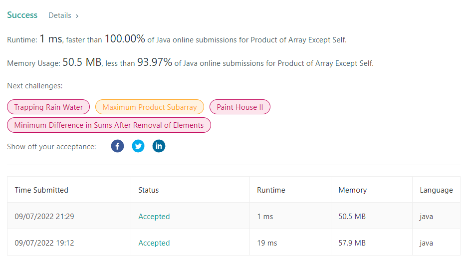 위 풀이는 첫 번째 풀이와 똑같은 로직 이지만 array를 하나만 사용한 풀이이다. answer array하나만 사용하기 때문에 space complextiy가 O(1)이다. 문제에도 나왔듯이 output array는 extra memory로 치지 않는다.