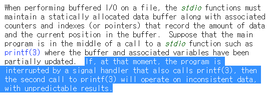 - 예를 들어 위 linux man page 링크에 따르면, printf() 는 async-signal-safe (비동기 신호 안전)가 아니다 (acquires the console lock)