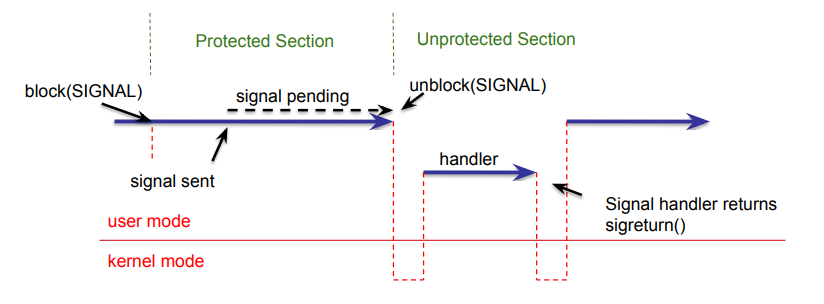 프로그램은 신호를 차단하여 부적절한 시간 동안 전달되지 않도록 할 수 있다. 보류 (pending) 상태가 되는 차단된 신호는 차단 해제 시 전달된다.