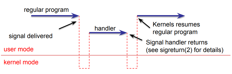 - 그런 다음 (잠시 후) 대상 프로세스가 신호를 수신하고 작업을 수행한다 (무시, 종료 또는 handler 호출).