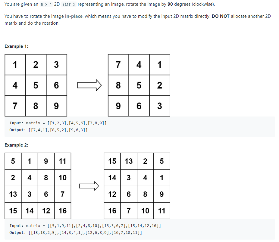 Leetcode 48번 문제에서는, n x n 2d array, 즉 matrix가 주어진다. Matrix의 각 index는 정수들로 채워져 있다. 그 주어진 matrix를 위의 예시 저럼 90도 오른쪽으로 뒤 집은 matrix를 return 하는 문제이다. 루빅스 큐브 앞면에 숫자들이 적혀저 있고 그 루빅스 큐브 오른쪽으로 한번 돌린다고 생각하면된다.