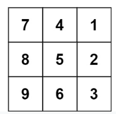 Transpose 한 matrix를 horizontally flip (오른쪽 끝 행과 왼쪽끝 행을 바꿈) 하면 원래 matrix에서 90도로 오른쪽으로 돌린 matrix가 된다.