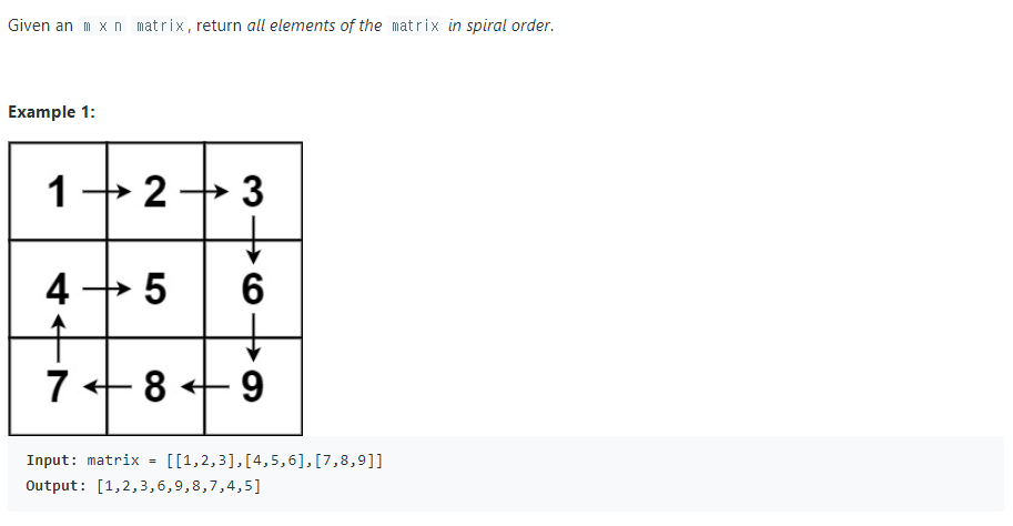 Leetcode 54번 문제는 m x n matrix 가 주어진다. matrix의 값은 1부터 n까지의 정수로 채워진다. 정수의 순서는 matrix에 나션형 모양으로 나열된다. 우리는 이 matrix를 나선형 (matrix[0][0] 에서 시작해서 오른쪽끝, 맨 아래, 맨 왼쪽, 위로를 matrix의 전체가 커버 될때까지 반복한다). 이 과정에서 각 index를 지날때마다, index에 있는 정수 값들을 list에 add해주면 된다, 그리고 그 list를 return해주면 된다.