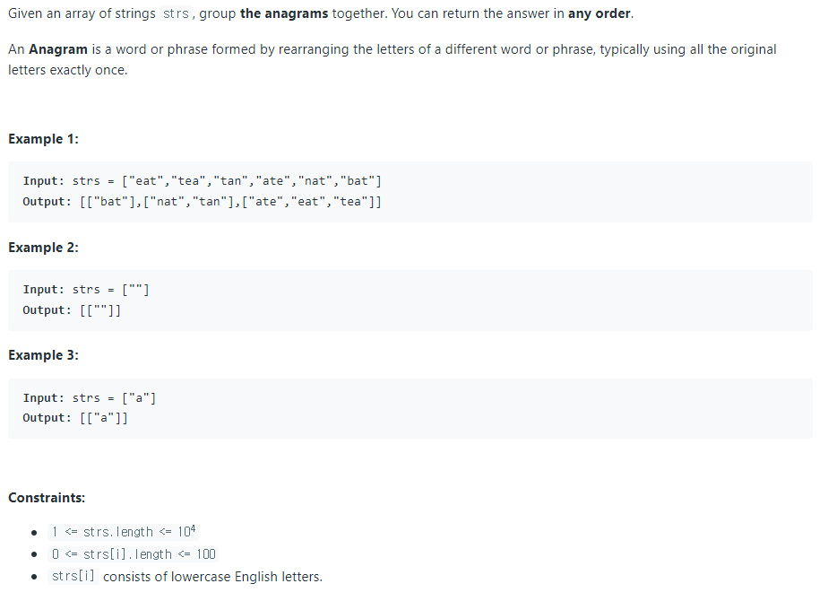 Leetcode 49번 문제에서는 여러개의 문자열이 주어진다. 주어진 문자열로 anagram을 만들수있는 문자열들끼리 묶은 sublist를 담은 list를 return 하는 문제이다. 여기서 anagram이란 주어진 철자들로 다른 단어를 만든다는 뜻이다. 예를 들어 race는 r, a, c, e를 사용해 care라는 단어를 만들수 있다, 이런것들이 anagram이다. 그래서 위에 주어진 예시 1번을 보면 nat을 n,a,t를 사용해 tan를 만들수있기때문에 묶고 (이 문제에서는 말이 안되는 단어여도 상관없다, 모든 문자만 겹치면 anagram으로 침), ate는 a,t,e를 사용해 eat과 tea를 만들수있기 때문에 묶는다, bat으로는 주어진 array의 문자열들의 anagram으론 바꾸지 못하기때문에 bat만 담긴 subarray를 추가한다.