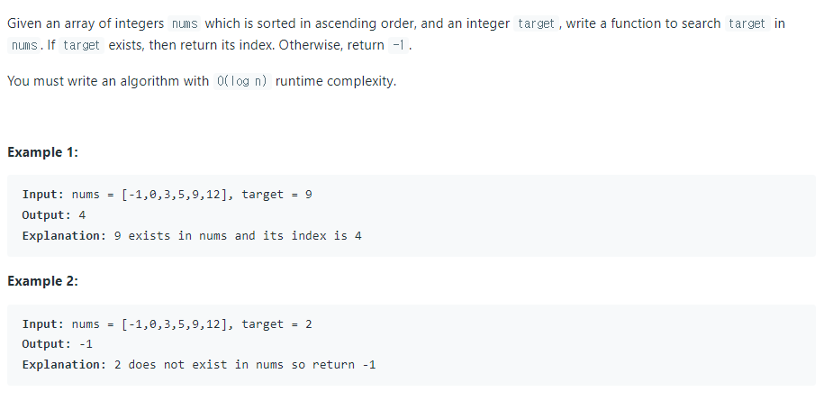 Leetcode 704번 문제는 integer array와 target value가 주어지면 binary search (이진 탐색)을 사용해 target value를 찾아내는 문제이다. 이진 탐색을 사용해야 하기 때문에 너무나 당연하지만 풀이 과정에서 time complexity (시간 복잡도)는 O(log n) 이 돼야 한다.
