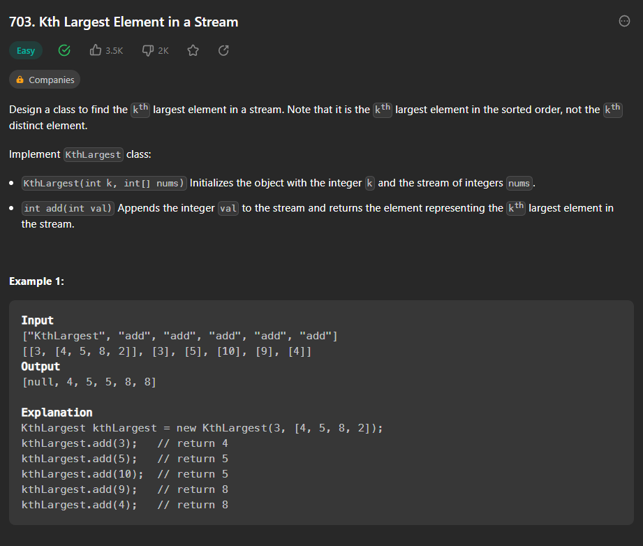 Leetcode 703번문제는 int k 와 정수 array가 주어진다. 또한 이 array는 stream이기때문에 계속 정수들을 array에 추가 시킨다. 이 문제에서는 주어진 array에 여러개의 정수를 add하고, add가 끝난뒤 array에서 k번째로 큰 정수값을 반환시켜주면된다.