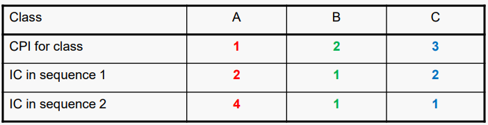 클래스 A, B, C의 명령어를 사용하여 컴파일된 대체 코드 시퀀스가 있다고 가정하자