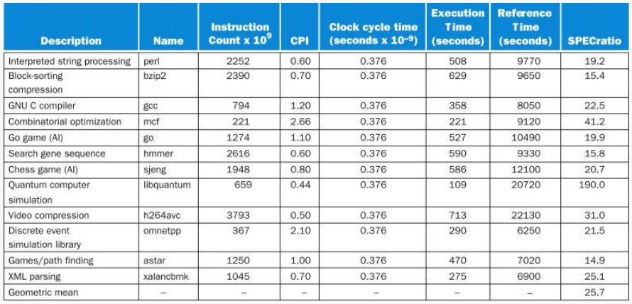 SPECINTC 2006 벤치마크는 2.66GHz Intel Core i7920에서 실행된다. 35페이지의 방정식이 설명하듯이 실행 시간은 이 표의 세 가지 요소, 즉 수십억 단위의 명령 수, 명령당 클럭 수(CPI), 나노초 단위의 클럭 사이클 시간의 곱이다.