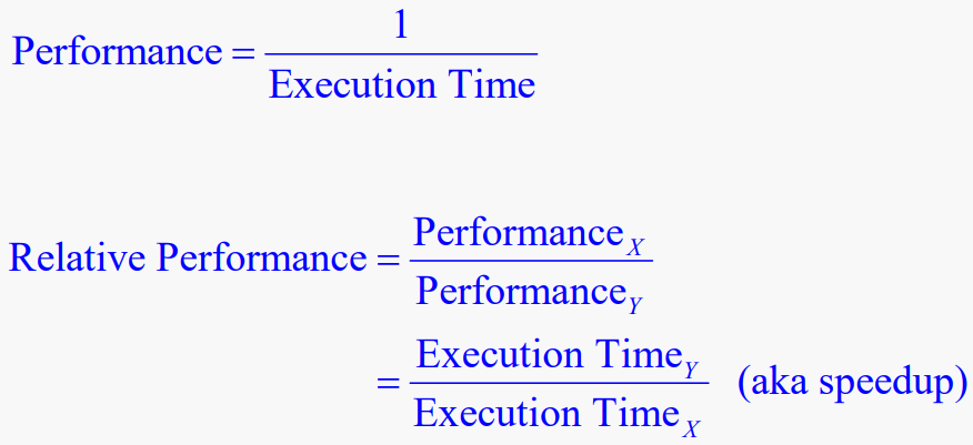 예를 들어 프로그램 A의 실행시간이 10초, 프로그램 B의 실행시간이 15초라고 가정해보자. 그렇다면 Execution TimeB / Execution TimeA = 15s / 10s = 1.5 이다. 그렇기 때문에 A는 B보다 1.5배 빠르다고 할 수 있다 (그리고 B는 A보다 2/3배 빠르다)