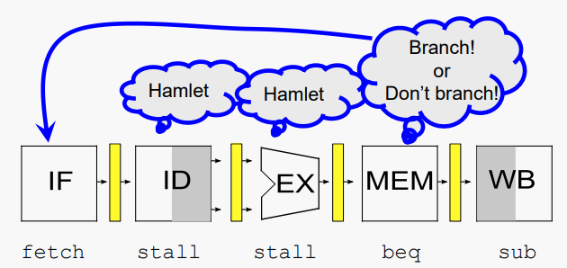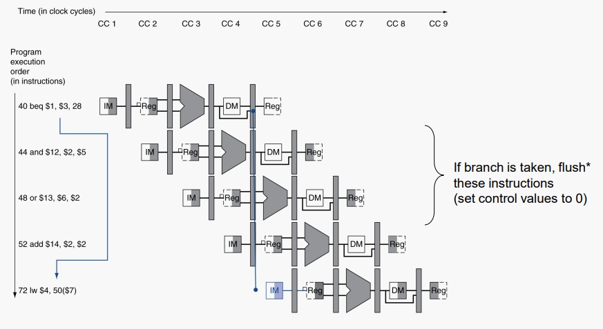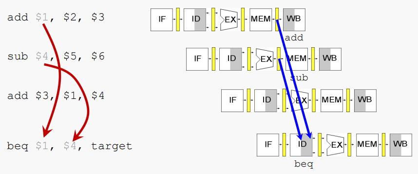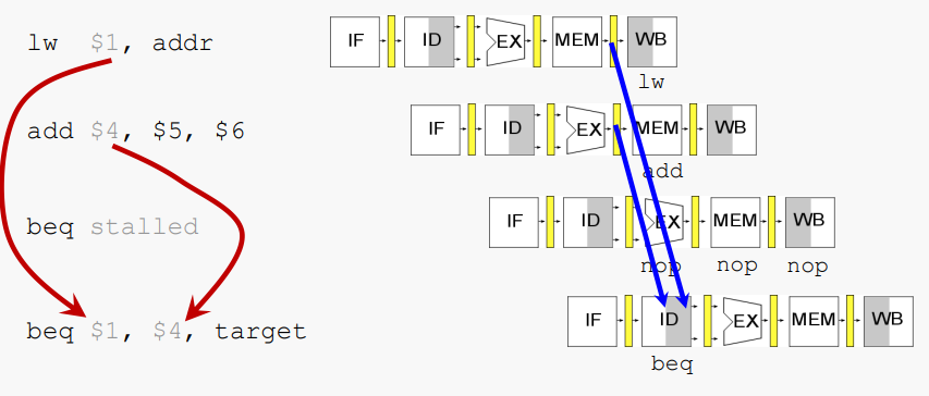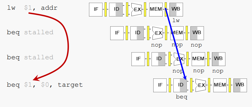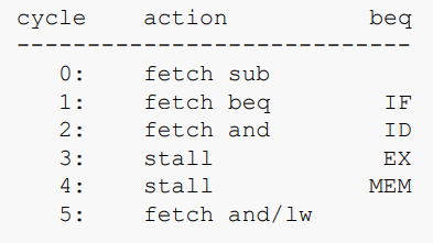 branch를 가져갈지 알 때까지 stall을 사용하면된다. beq가 MEM 단계에 도달하기 전에는 해당 정보에 대해 조치를 취할 수 없다.