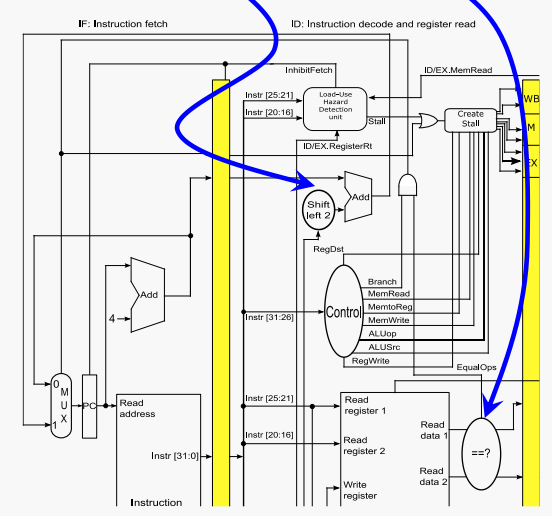 우리는 beq가 EX 단계에 도달하기 전에 브랜치를 가져갈지 여부를 결정할 수 있다. 하지만 우리는 또한 한 사이클을 위한 스톨을 만들어야 한다